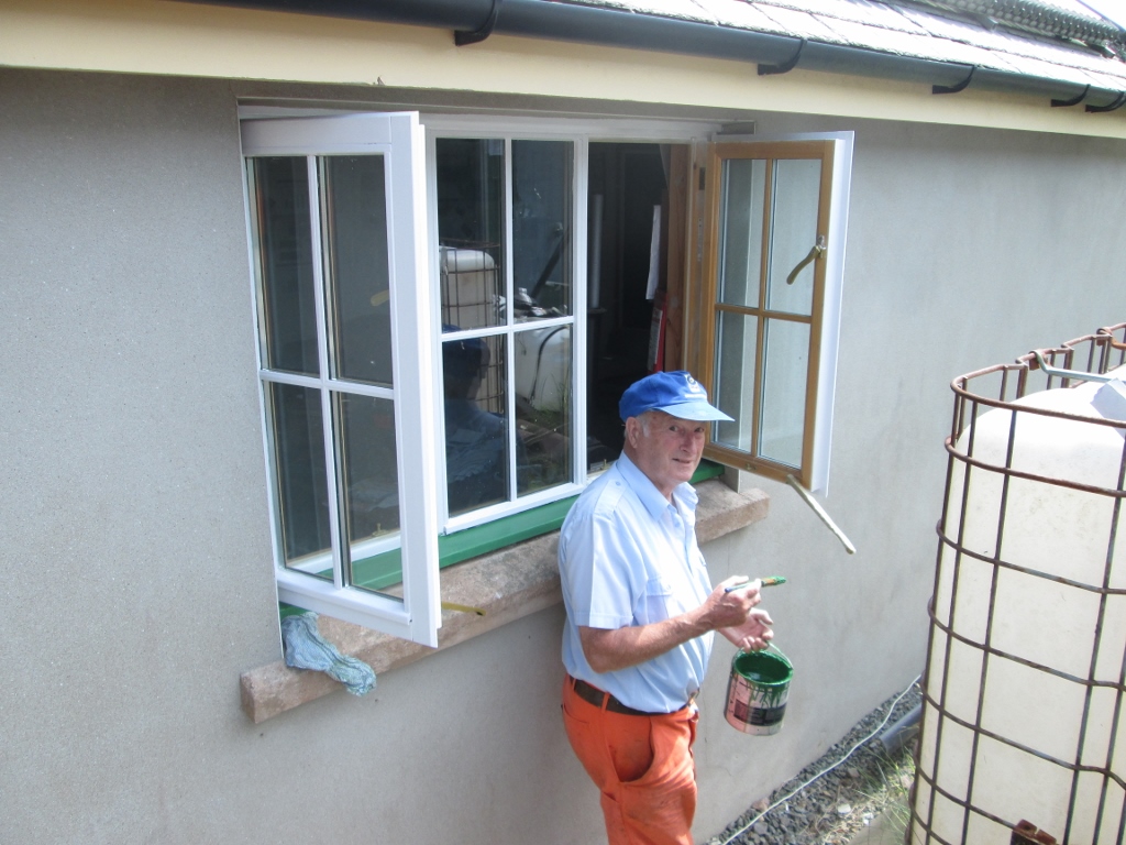9. Jim Price paints the mess room window frames in the green and white Southern Railway livery