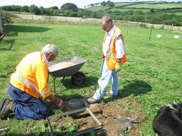 15. A variety of odd jobs have been undertaken recently. Here Les and Martin install a manhole cover for access to a sub-surface drain.