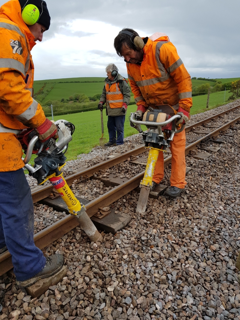 11. The track gang braved the April Showers to resume more jacking and packing and tamping with the petrol tamping machines.