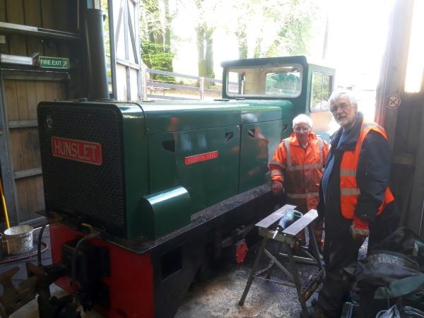 5. Hunslet diesel HEDDON HALL, after it's repaint last week, back in traffic already with an open DZ wagon outside the shed.
