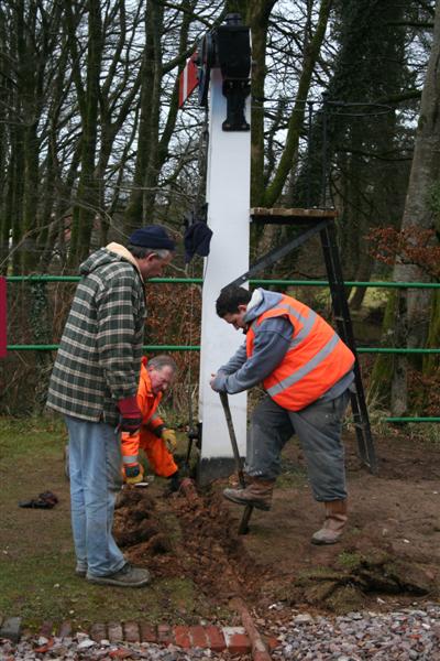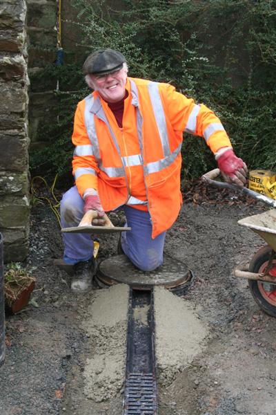 2. Robin Edwards packing in the concrete to secure the pipe.