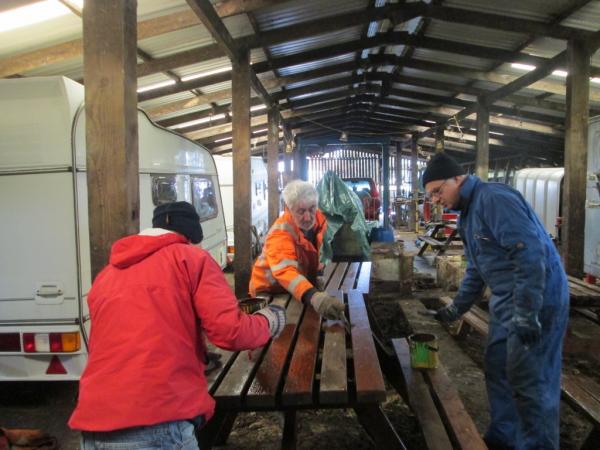 1. An early job today in the barn at Rowley Moor Farm was painting the stored picnic tables before their return to Woody Bay. Roger Bye, Rob Ford and Jim McFarlane get stuck in with this task.