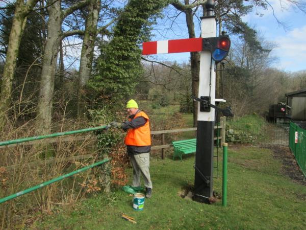3. Nigel Spencer was busy cleaning up and painting the pipe tubes on the down platform fence.