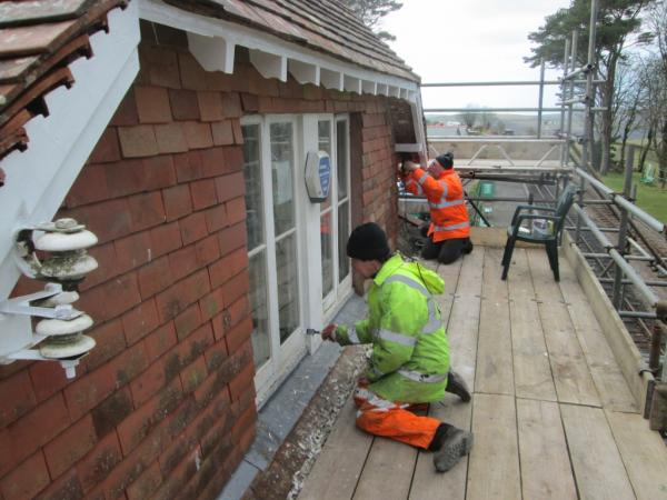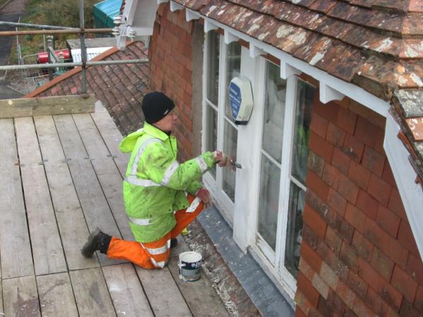 4. Meanwhile, up on the scaffolding, Dave Evans was painting the woodwork around the upstairs windows.