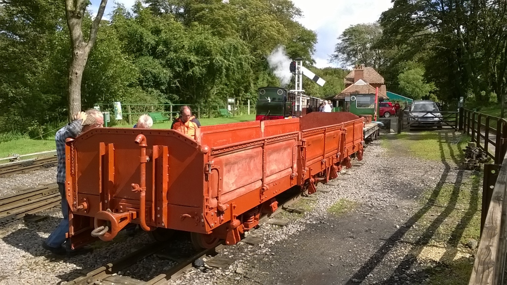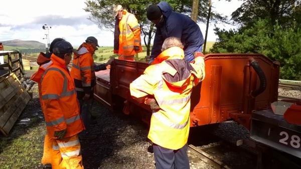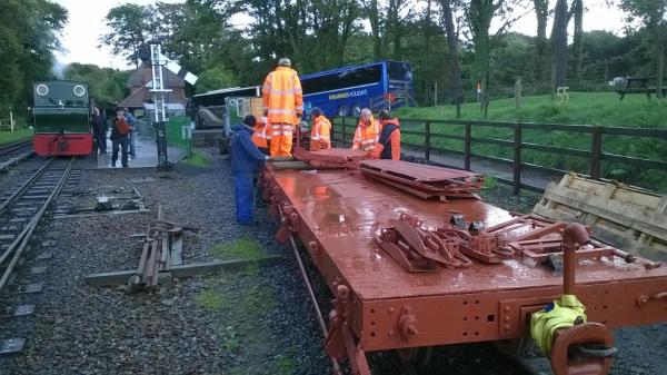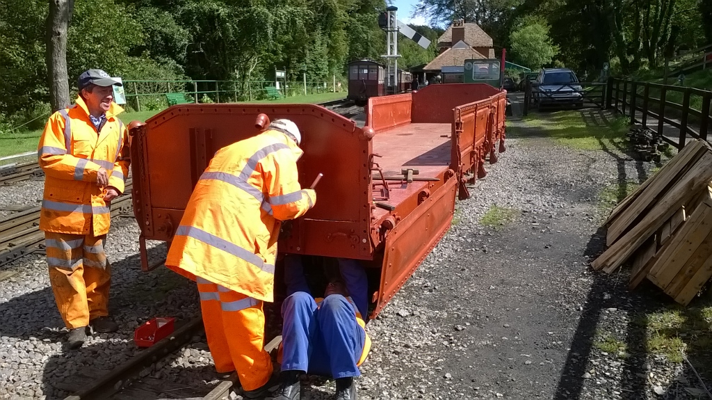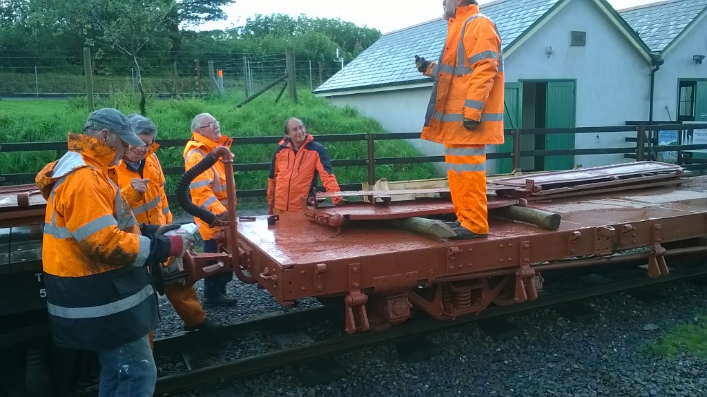1. Orange men and the orange wagon. The 'DZ' bogie flat/open that arrived last week from South Africa still needed its sides and ends put back on. The gang surround the wagon and discuss the methods of fitting.