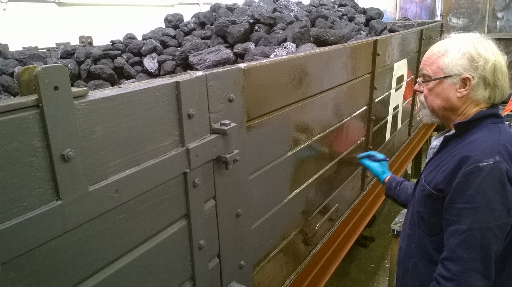 9. Last seen lying down, Roger Bye now helps out in the shed with the repaint of SR liveried bogie open No.28320.