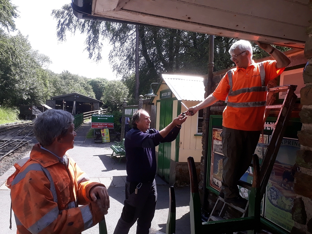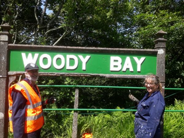 25. Back at Woody Bay, south Devon based volunteers - Julian and Lindsay Palmer came along today to carry out a repaint of the running-in boards. These signs were cast and installed onto the original posts as far back as 1995-7, helping to identify Woody Bay Station and our intended aims and ambitions.