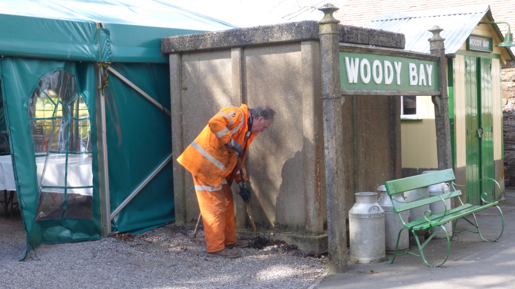 3. During a quiet moment at Woody Bay Station, Hunslet diesel HEDDON HALL runs through with the excavator.