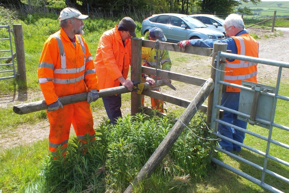 6. At Killington Lane the task was to replace rotten posts and rewire the fence. Sounds easy, but having to install struts at changes of direction and at end posts slowed things down a bit. Roger Bye, Dave Evans and Mike Corner drive a post. (The post driver got heavier as the day wore on.)