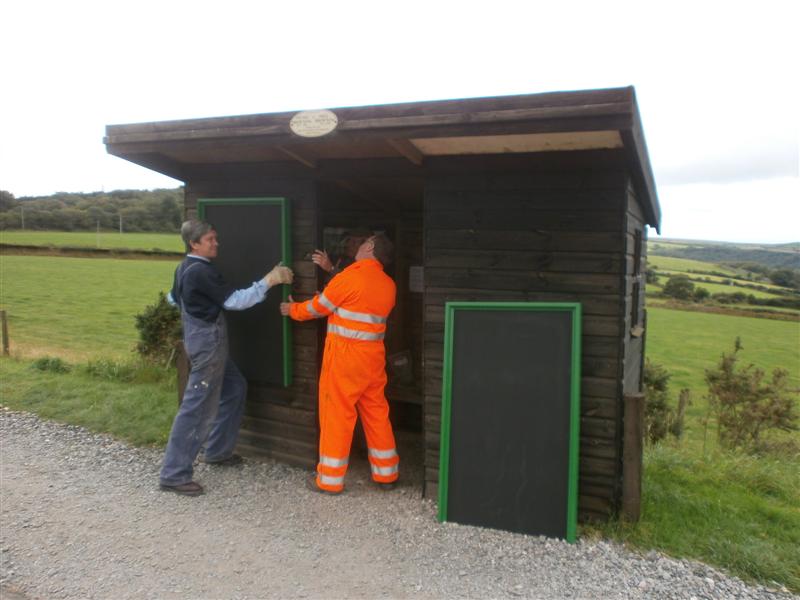 4. One job today for the gang was to install new poster boards onto the waiting shelter at Killington Lane. Dave Evans and Martin Williams with Jim Price (inside) tackle this project.