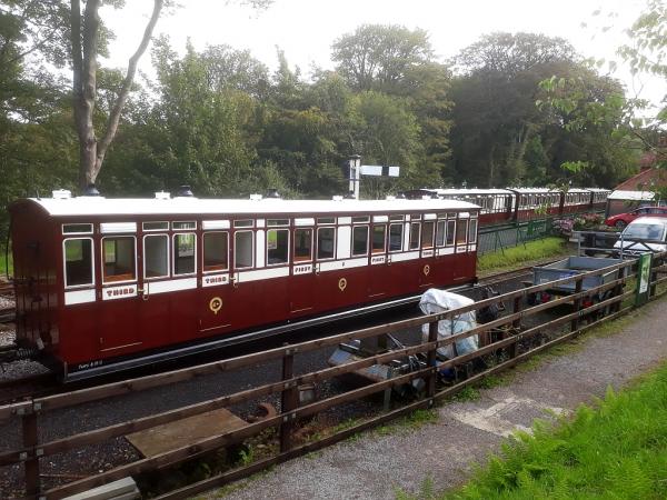 1. As new Heritage Carriage No.5 is being fitted with its couplings, it was today stabled for a short time in the loading dock with the other 4 carriages behind, creating an early view of all 5 L&B carriages together at Woody Bay.