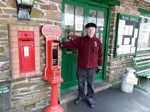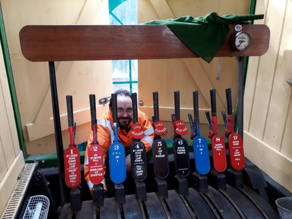 2. One of the L&B's signalling experts, Rob Prosser, has been down this week assisting with the recent upgrades and alterations. Rob is seen here accessing the back of the signal cabin lever frame to adjust the locking mechanism for the new down platform up starter signal.
