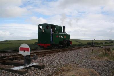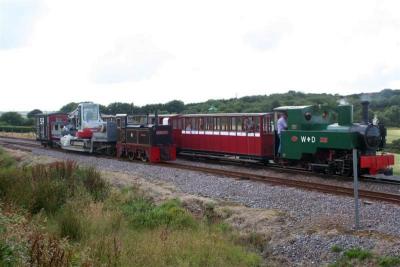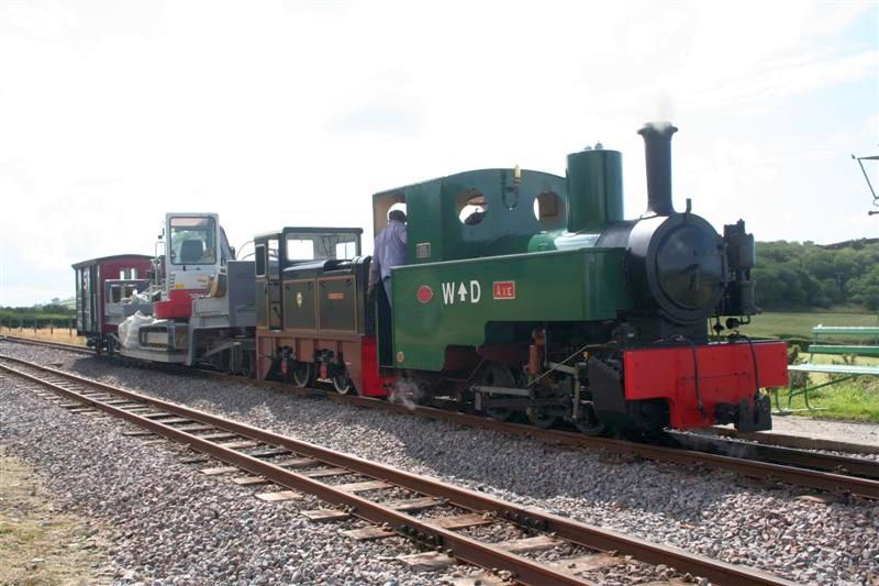 16. Two trains alongside each other at Killington Lane as AXE prepares to leave with an afternoon service and the works train awaits its later return to Woody Bay.