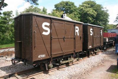 19. The refurbishment and repaint of the ex-MoD Box Vans progresses from the work in the shed. Recently renumbered Tools Vans SR No.s 47061 and 47062 are currently on display in the loading dock siding.