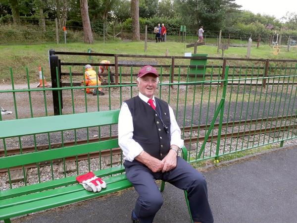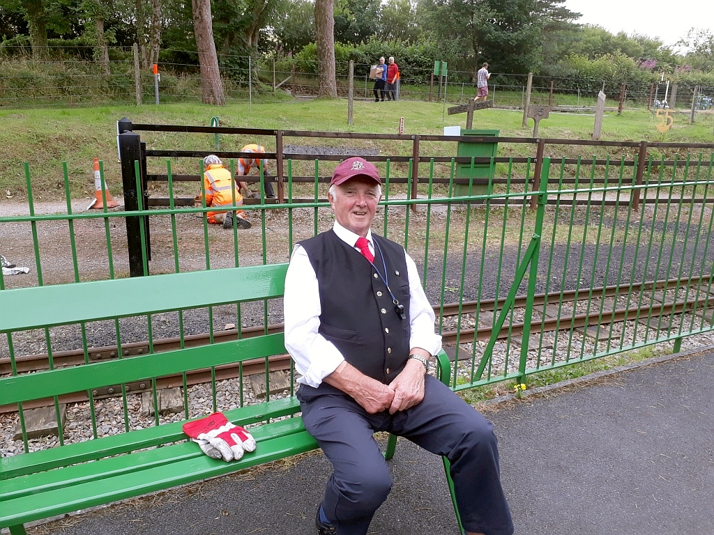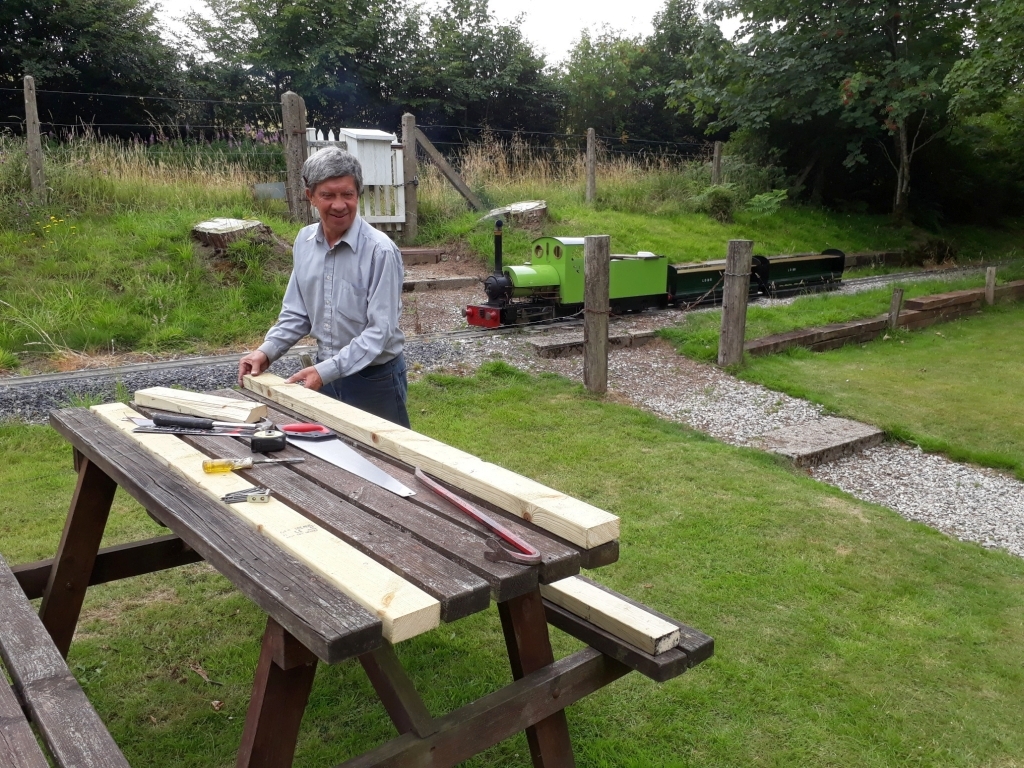 13. Dave Evans continues repairs to the picnic tables on the upper lawn whilst locomotive LITTLE OLLIE with the miniature train waits beyond.