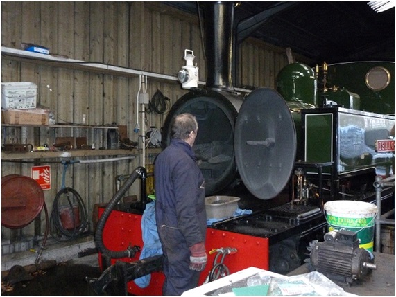 3. John Uphill cleans out ISAAC's smokebox. A good deal of stock, material and engine shifting was required to rearrange the shed to facilitate the anticipated winter programme of repair, renovation and modification. Some movements were under loco power and others under man-power! Locos AXE, PILTON and ISAAC all had an airing before going into hibernation!