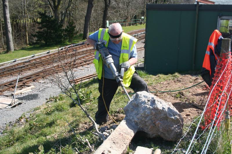 8. Nigel Spencer with a Kango hammer chopping the concrete off from the large concrete gate post.