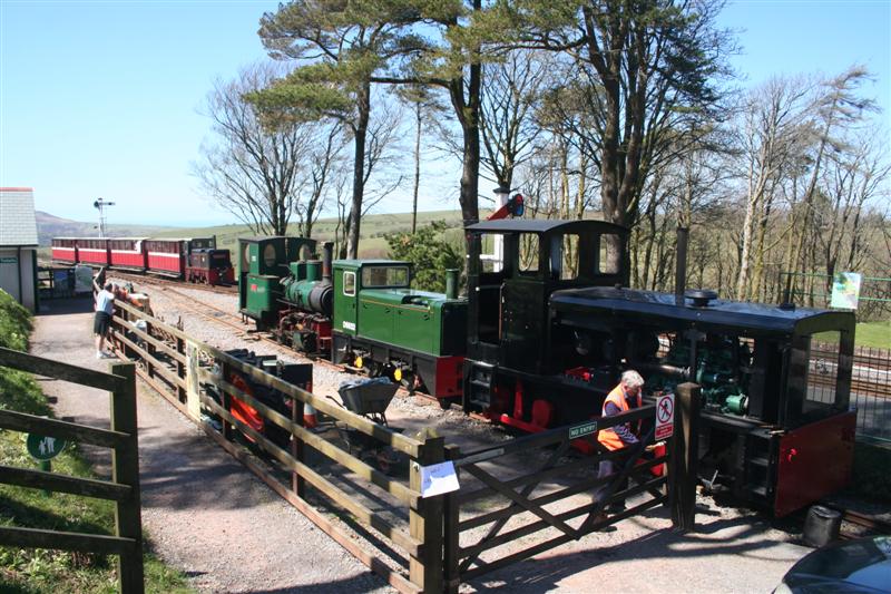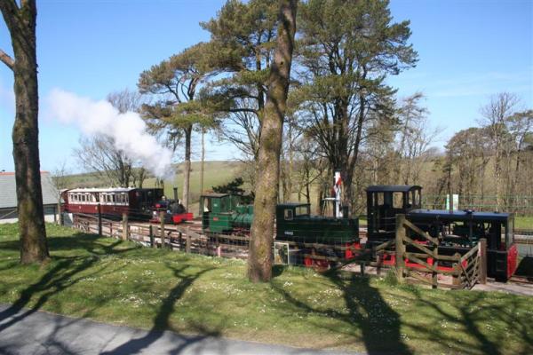 12. Locos galore as HEDDON HALL arrives with the afternoon passenger train past the stabled loading dock locomotives.