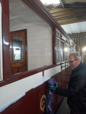 7. & 8. .... Geoff Long and Jim Pounds tidy up paintwork of Carriage No.7, in advance of next week's special event.