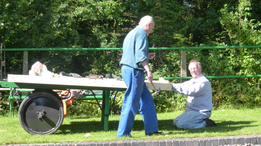 11. It seems that Martin Williams (right) has had to drop to his knees to work with carpenter Jim Price as the new board takes shape this afternoon, using a platform trolley as a work-bench.