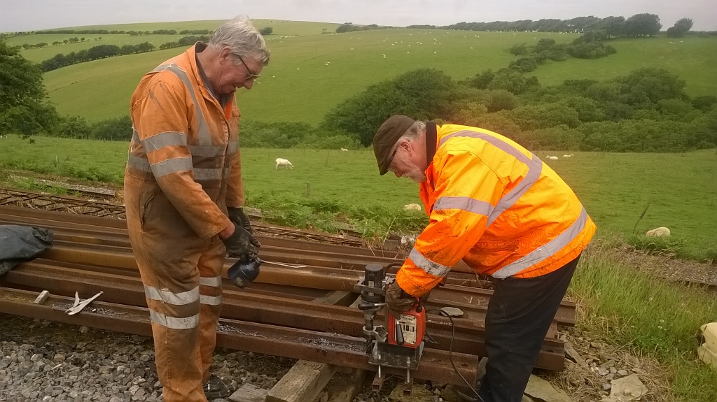 1. & 2. Another day of progress on the rail-built signal posts project. AXE passes Dick Gunn and Don Newnham drilling holes into these standard gauge bullhead rails.