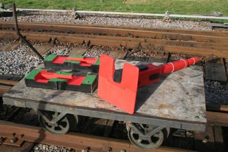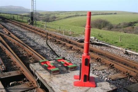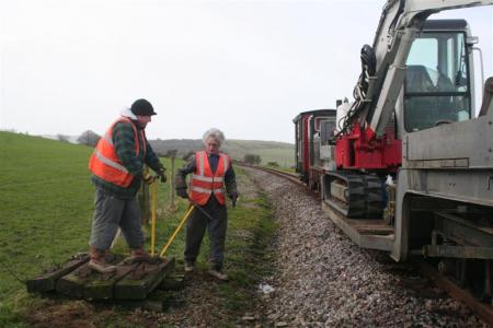 3. Nigel Thompson drove a works train down (up) the line to the sleeper storage area near Bridge 67. Andy Foster (left) and John Heys remove surplus baseplates from several old short length sleepers prior to eventual disposal.