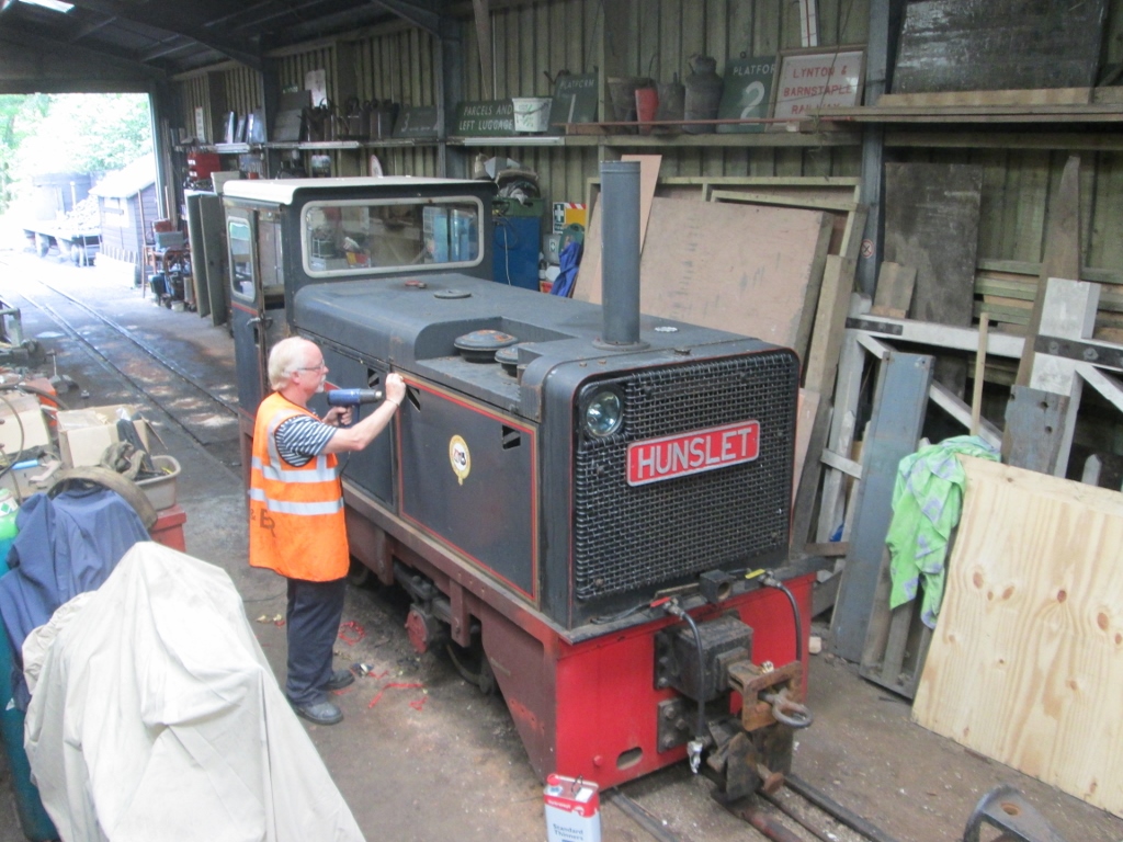 5. Hunslet diesel HEDDON HALL is back in traffic, but the old lined black livery is looking shabby now. Jim Pounds has taken on the repainting project. His first job is to remove the lining, which he himself had applied back in 2007.