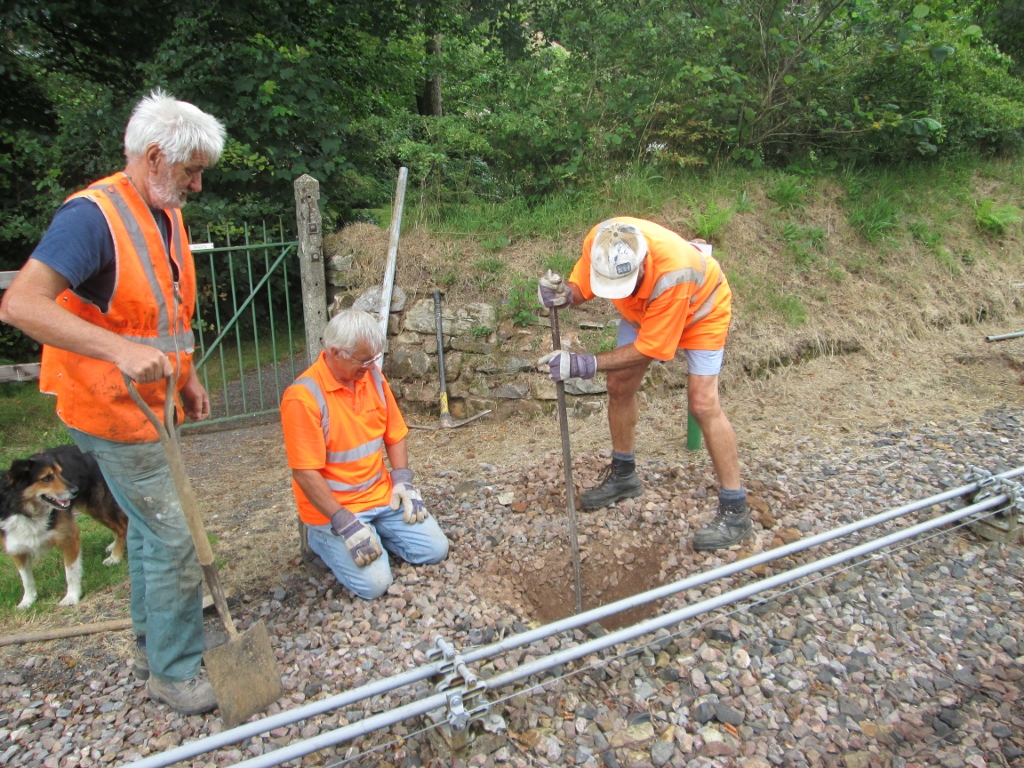 6. The hole-digging gang of Jim McFarlane, Roger Bye and Mike Corner were tasked with installing a pair of posts to support some railings located by the gated access to Moorlands.
