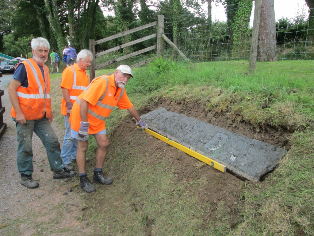 12. The stored original concrete WOODY BAY running-in board has now been installed for display alongside various other items of trackside furniture on the bank beside the path to the toilets. Jim, Roger and Mike adjust the sign into place on the bank.