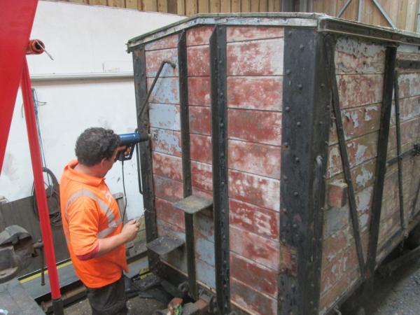 11. In the shed, photographer Nigel Thompson worked on the re-gauged ex-MoD box van. After lunch, Andy Foster also came to help with the bodywork paint removal for this rolling stock project.