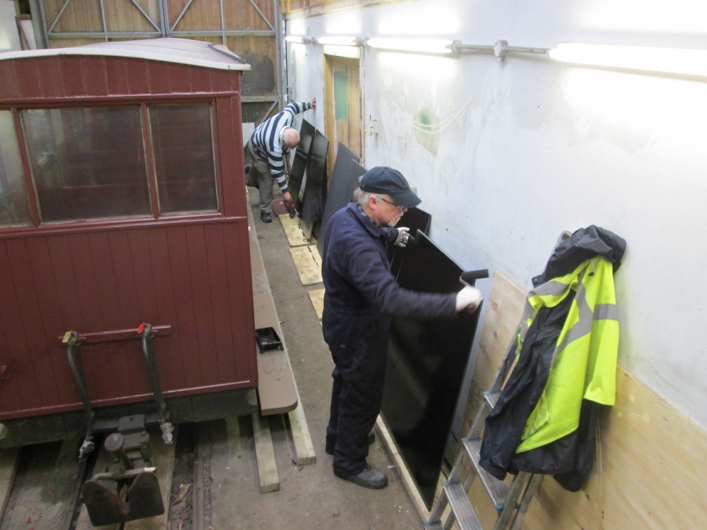8. In the paint shop Jim and Nigel are now painting top coat black onto Baguley Diesel PILTON's new plywood side panels.