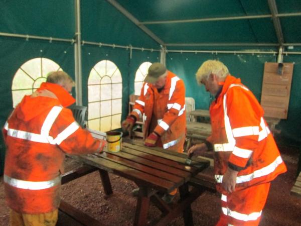2. In the marquee John Villers, Graham Bendell and Jim McFarlane paint a picnic table, whilst ...