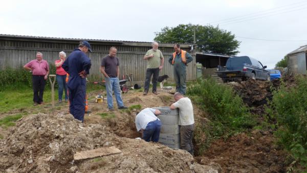 4. Another concurrent task at the farm was to construct a manhole in which to connect the two drains uncovered last week. The precast sections were manhandled into place, the pipes connected ...