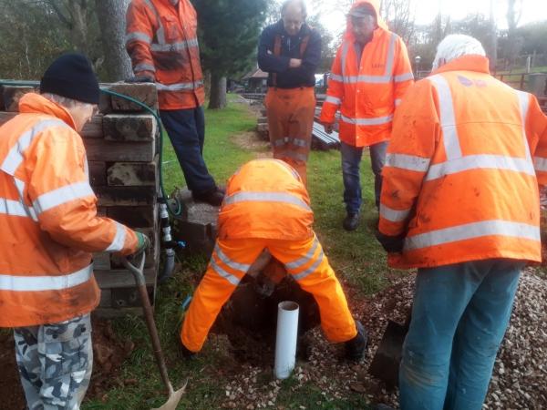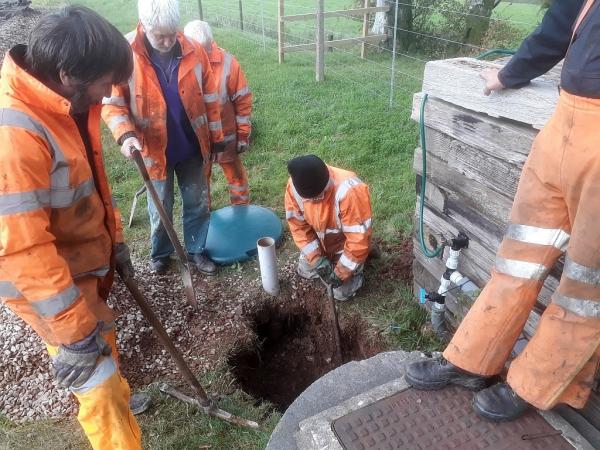 Hole digging! Volunteers take turns to dig out a new hole for an extra inspection chamber for the septic tank. Others watch!