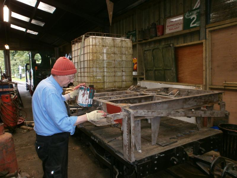 6. Martin Andrews painting primer onto a recently cleaned up bogie for the regauging of ex MoD bogie flat wagons.