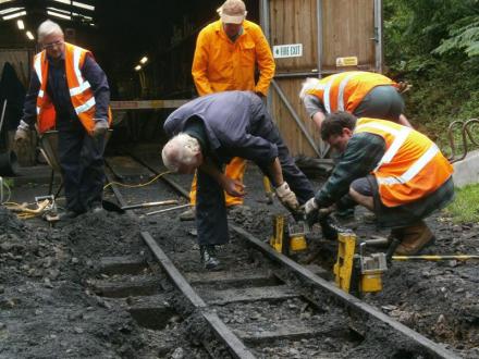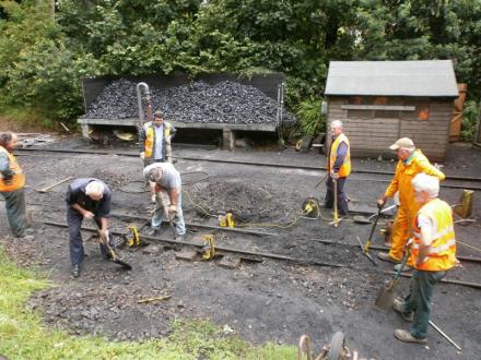 1. Outside the shed, a rail joint on the pit road had dropped here causing couplings to jam when locos and stock were positioned here. The gang dig out the ash and ballast to reveal the sleepers and place the jacks in.