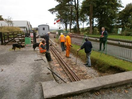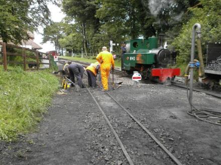 After lunch another track project was begun. The lighter 40lb. weight rail in the loading dock needs to be upgraded to allow a smoother ride and better alignment throughout the siding particularly for the regular 'Driver for a Fiver/Donation' and footplate experiences during the special events each year. Some 50lb. weight rails were stored in the headshunt nearby so it was decided to use these to do the first length back from the loading dock buffer stop. All the wagons including Van 23 were moved out of the way to allow access to the track at the loading dock.