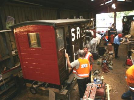 7. Latest view of the now SR lettered Brake Van as Tim & John discuss further work as they complete the fitting out inside the van.