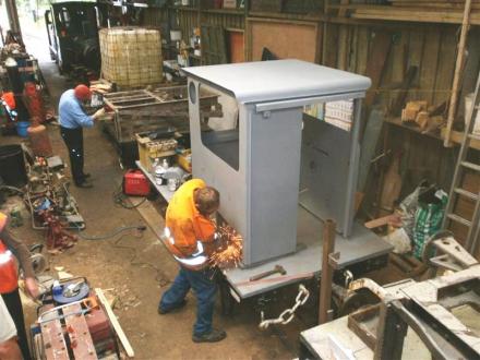 8. Graham works on the cleaned up cab of Hunslet diesel D6652 under restoration.
