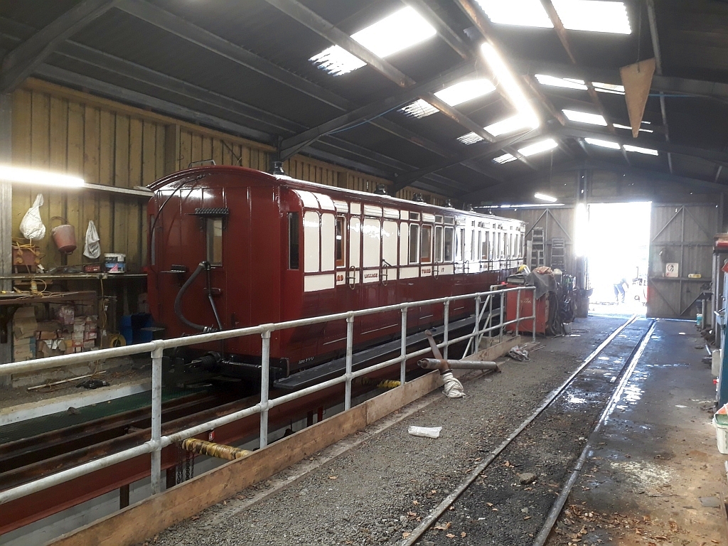 5. Carriage No.17 in the shed jacked up over the pit as its bogie is outside being overhauled.