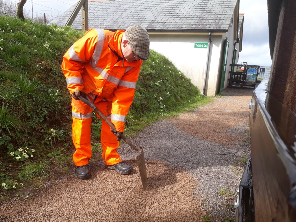 7. Visiting volunteer, Ian James from Hampshire, was busy spreading extra chippings onto the public path to the toilets.