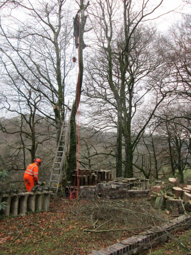 With suitably qualified tree surgeons Chris Bull and Chris Lines on site, the programme of tree clearance at Chelfham was continued. Several overhanging trees by the station building and over the down platform needed removal and Chris Bull "climbed" these respective trees to lop branches and also fell the trees as required.