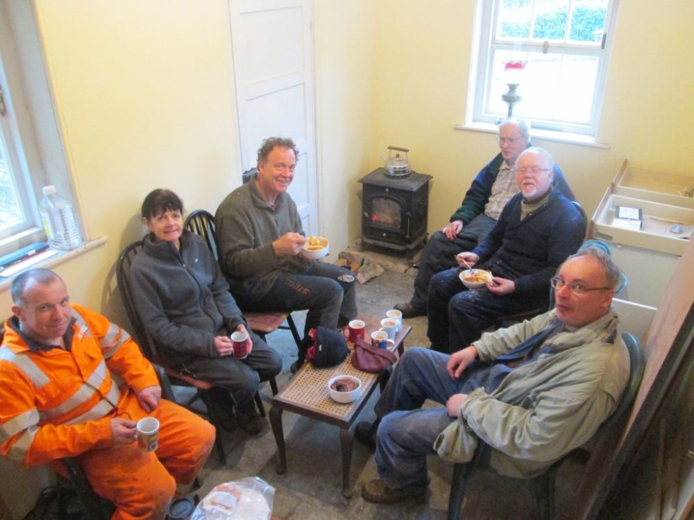 3. Lunch was held in the waiting room (still under restoration). L to R - Chris Lines, Judy Williams (who provided soup, rolls, tea and cake to be enjoyed by today's small gang) Chris Bull, Graham Lee, Jim Pounds & Andy Leckenby.
