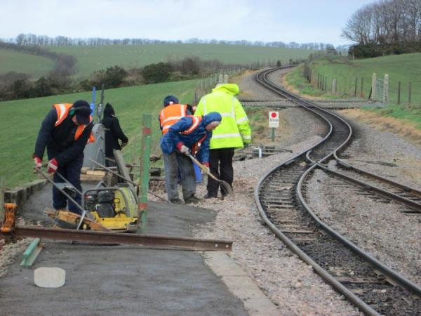 Ever so windy today and guess what? We the volunteers had to go down the line to the most exposed part, at Killington Lane Station, to continue finishing the project to relocate the lever frame and surfacing the extended platform and path to the frame.