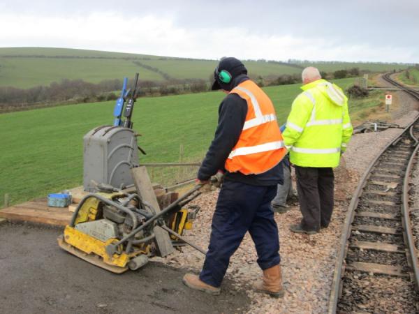 3. Andy Foster with the motorised 'whacker' compressing the stone around the path to the lever frame.