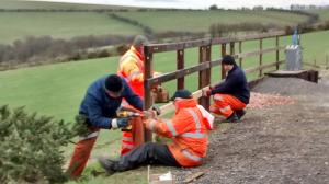4. In this view you can see that sections of steel rail have been driven into the ground to form vertical posts and timber horizontal rails are being fixed to these steel posts. The light coloured fencing by the lever frame in the foreground was the section installed in 2013 that you can see in photo 3 above.
