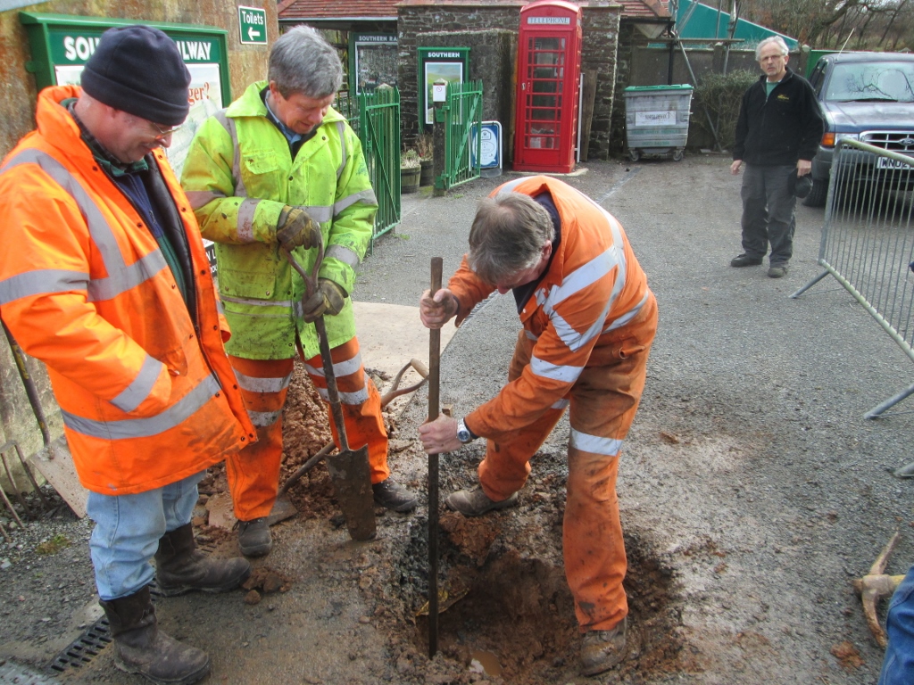 5. Another job was to cast two more point rod bases from the moulds especially made by Graham Varney. Graham Lee (left) assisted in preparing a concrete mix, which was then vibrated into the moulds using the new vibrator poker recently purchased using the General Manager's Equipment Fund.