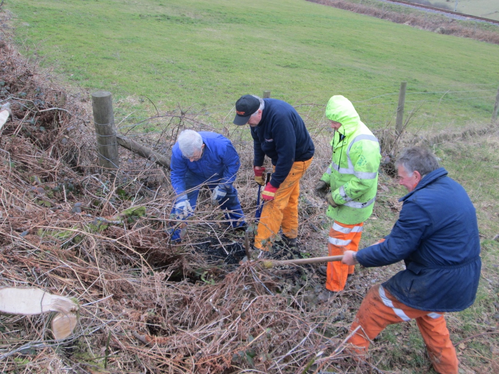 8. Roger Bye, Graham Bendell, Dave Evans and Dave Robinson tug old fence wire out of the hedge line.