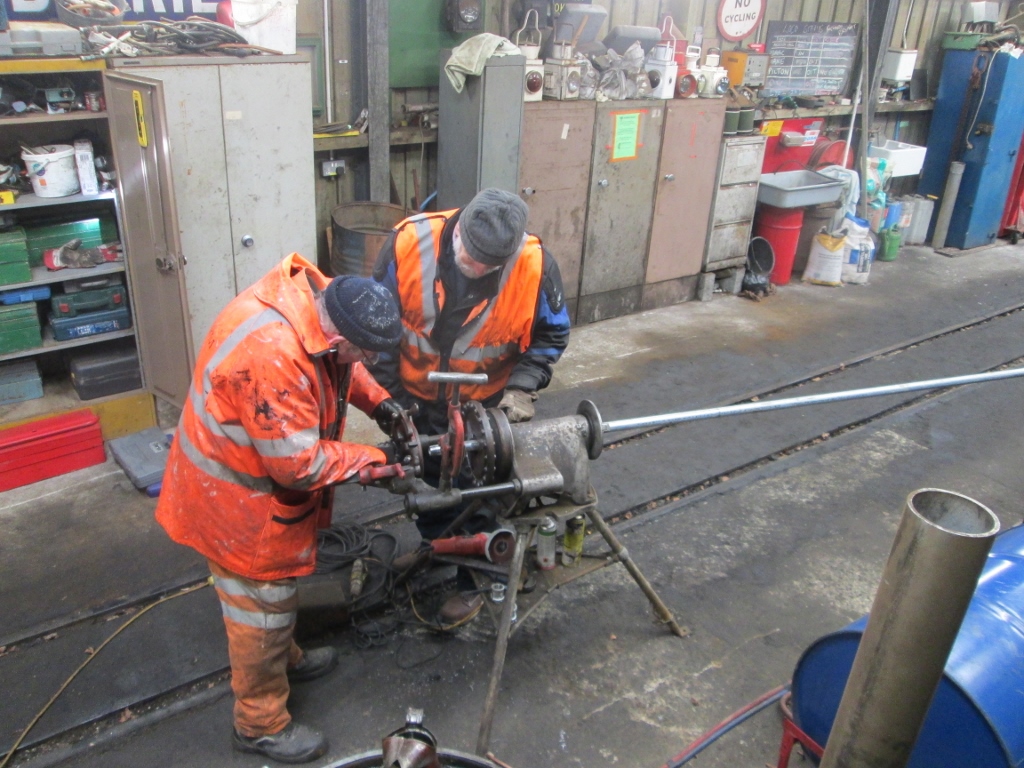 10. Dick and Don using the thread cutter, create a thread on the end of a pipe to enable connectors to be fitted.