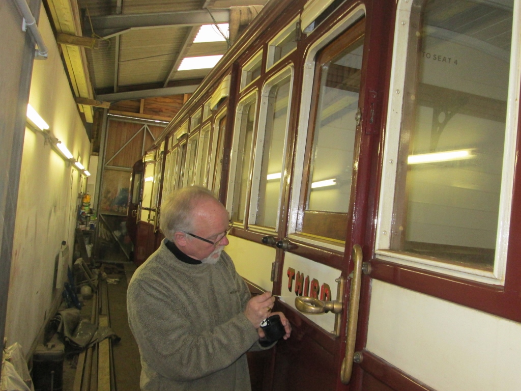 11. Finally, Jim Pounds maintained a lonely vigil in the paint-shop working on Carriage No. 17. Jim has been repairing/repainting flaking paint around the door windows and also been touching-up the cream-coloured panels where required.